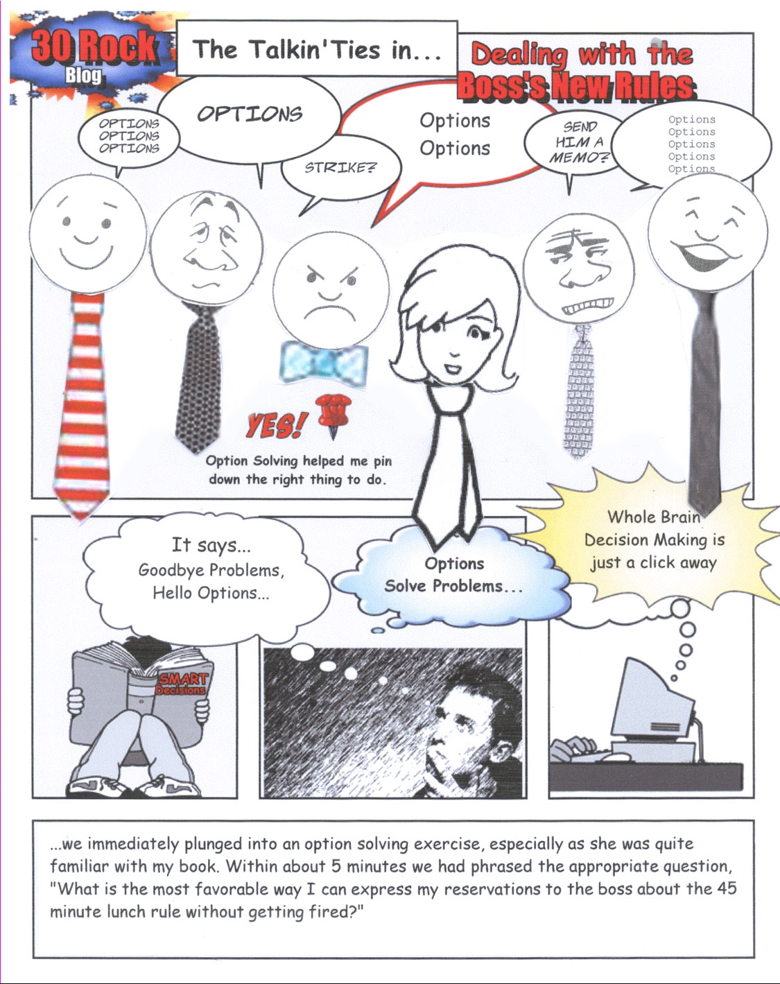Instead of offering advice (not a great idea), we immediately plunged into an option solving exercise, especially as she was quite familiar with my book. Within about 5 minutes we had phrased the appropriate question, “What is the most favorable way I can express my reservations about the 45 minute lunch rule without getting fired?” (See also Latest Example).